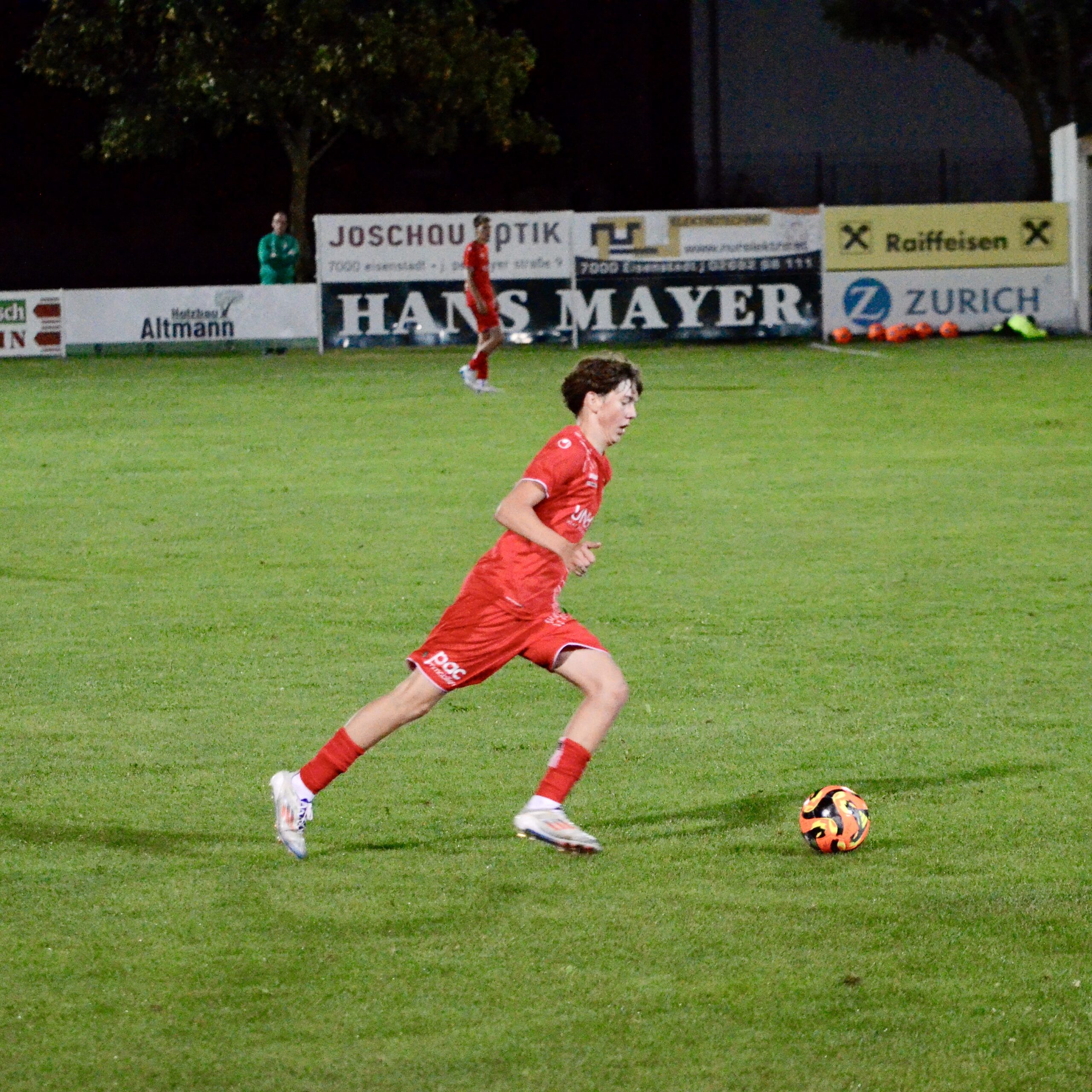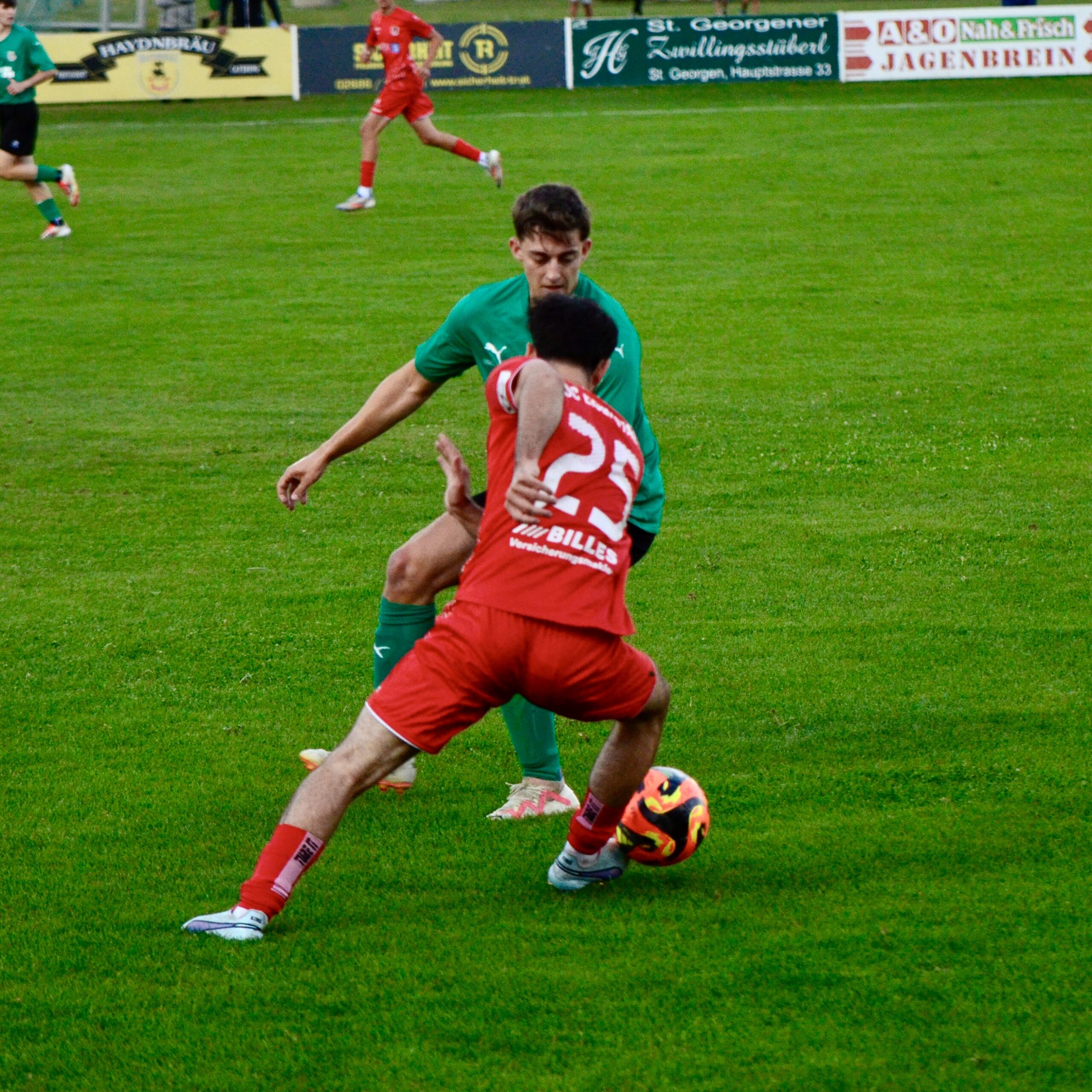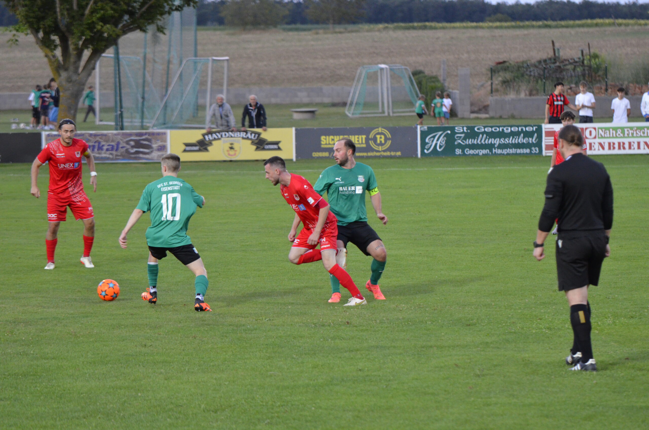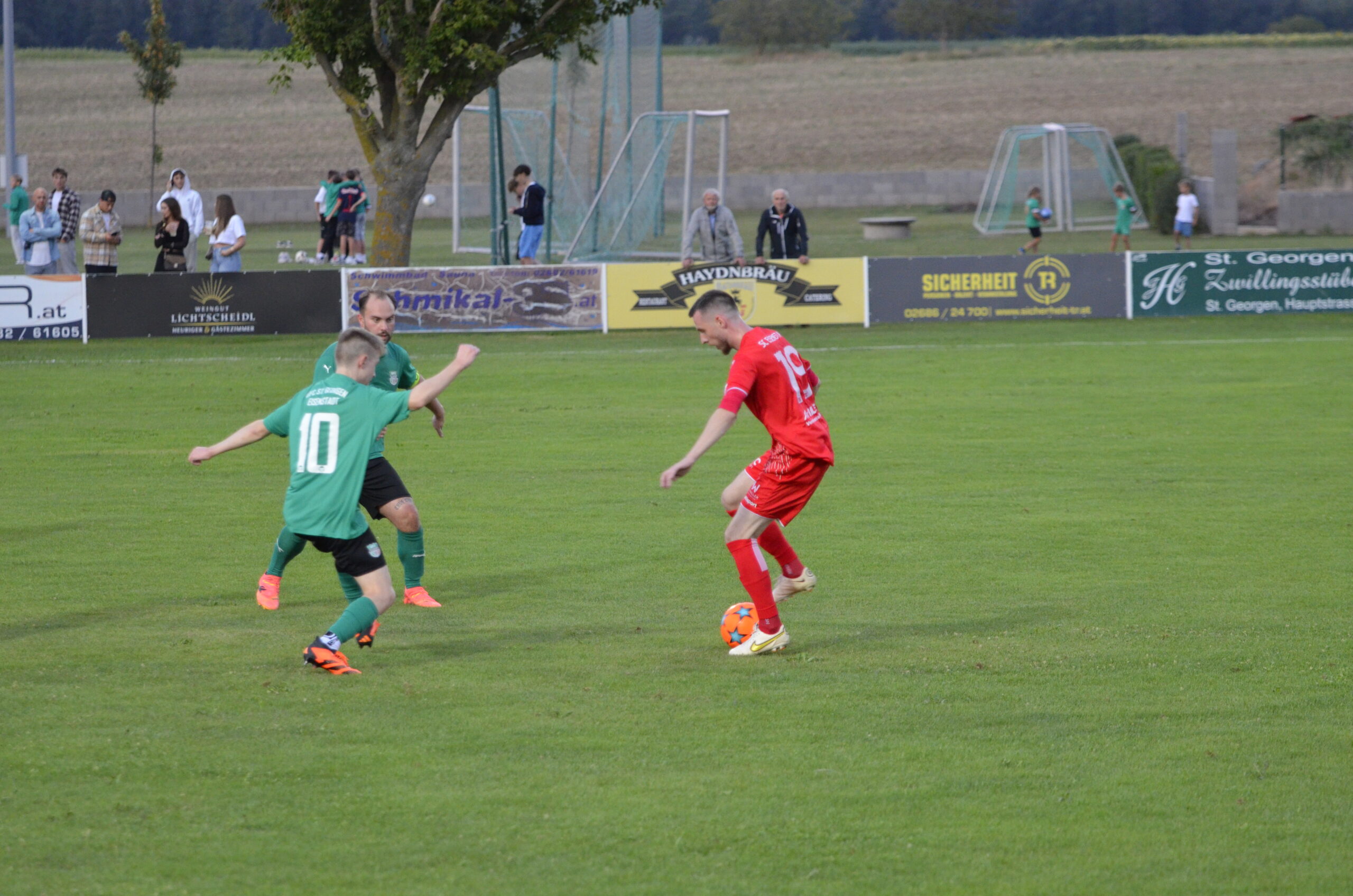 Schon in der 3. Minute zeigten die Gastgeber aus dem Stadtteil St. Georgen ihre Gefährlichkeit. Ein Freistoß von Kilian Buchreiter knallt an die Stange. Nur 3 Minuten später kommt Max Manninger aus linker Position aus kurzer Distanz zum Schuss, den Abpraller kann Christopher Pinter per Kopf nicht verwerten. In Minute 13 ist es dann aber soweit. Max Manninger wird von der Abwehr allein gelassen. Er kann einen Sololauf aufs Tor starten und zum 1:0 abschließen.